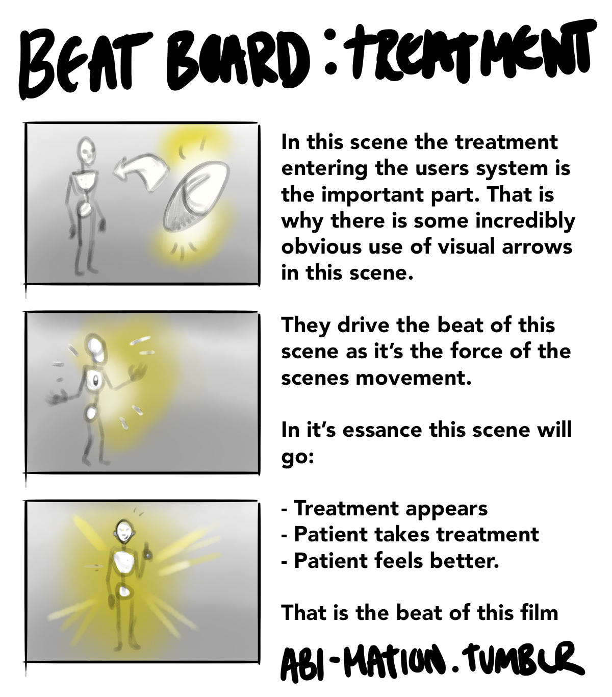 So in addition to having made a storyboard I made a couple of beat boards to take to my clients to they would understand how I was planning on making certain more complicated to explain scenes work. Plus this gave me the chance to work through some of those scenes and think about them ahead of making the animatic. Meaning I wasn't walking into those scenes too blind.